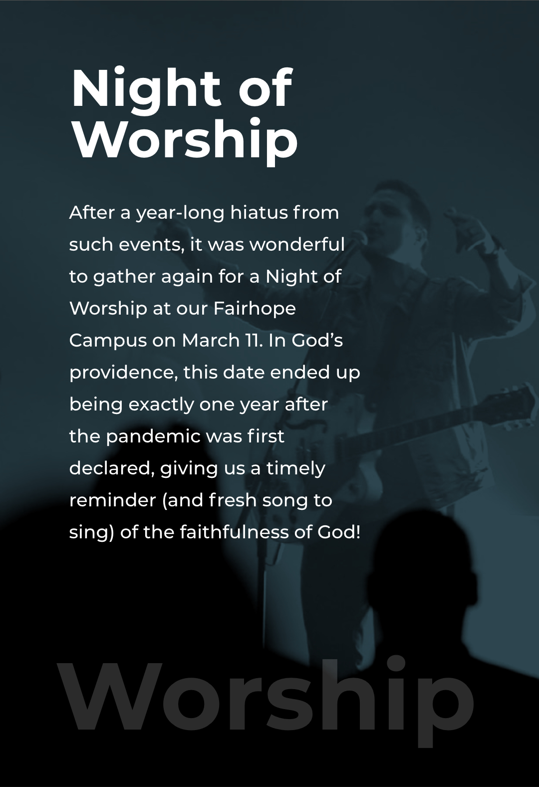 After a year-long hiatus from such events, it was wonderful to gather again for a Night of Worship at our Fairhope Campus on March 11. In God’s providence, this date ended up being exactly one year after the pandemic was first declared, giving us a timely reminder (and fresh song to sing) of the faithfulness of God!