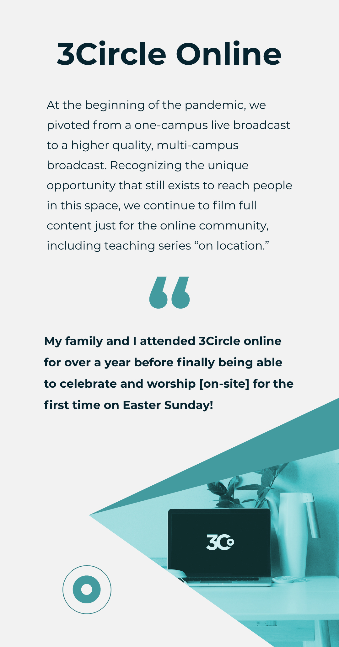At the beginning of the pandemic, we pivoted from a one-campus live broadcast to a higher quality, multi-campus broadcast. Recognizing the unique opportunity that still exists to reach people in this space, we continue to film full content just for the online community, including teaching series “on location.”