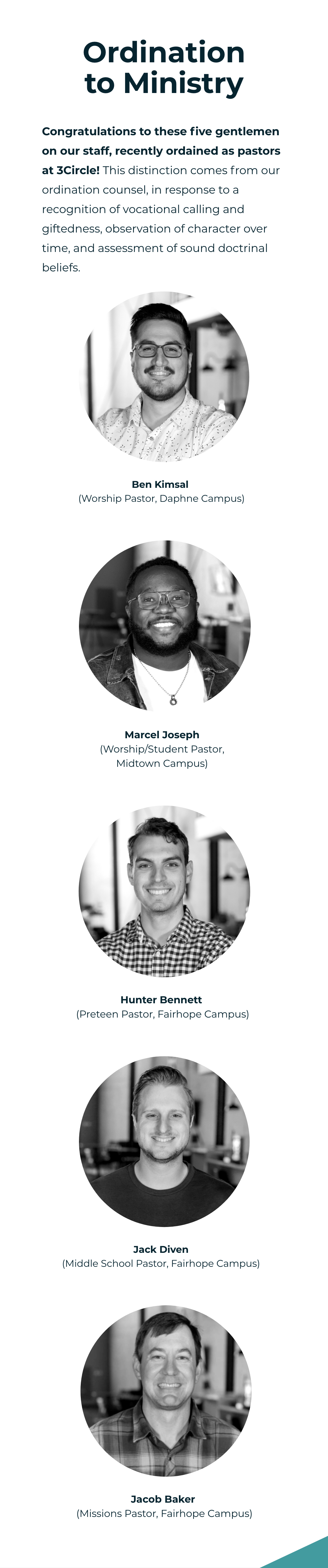 Congratulations to these five gentlemen on our staff, recently ordained as pastors at 3Circle! This distinction comes from our ordination counsel, in response to a recognition of vocational calling and giftedness, observation of character over time, and assessment of sound doctrinal beliefs.