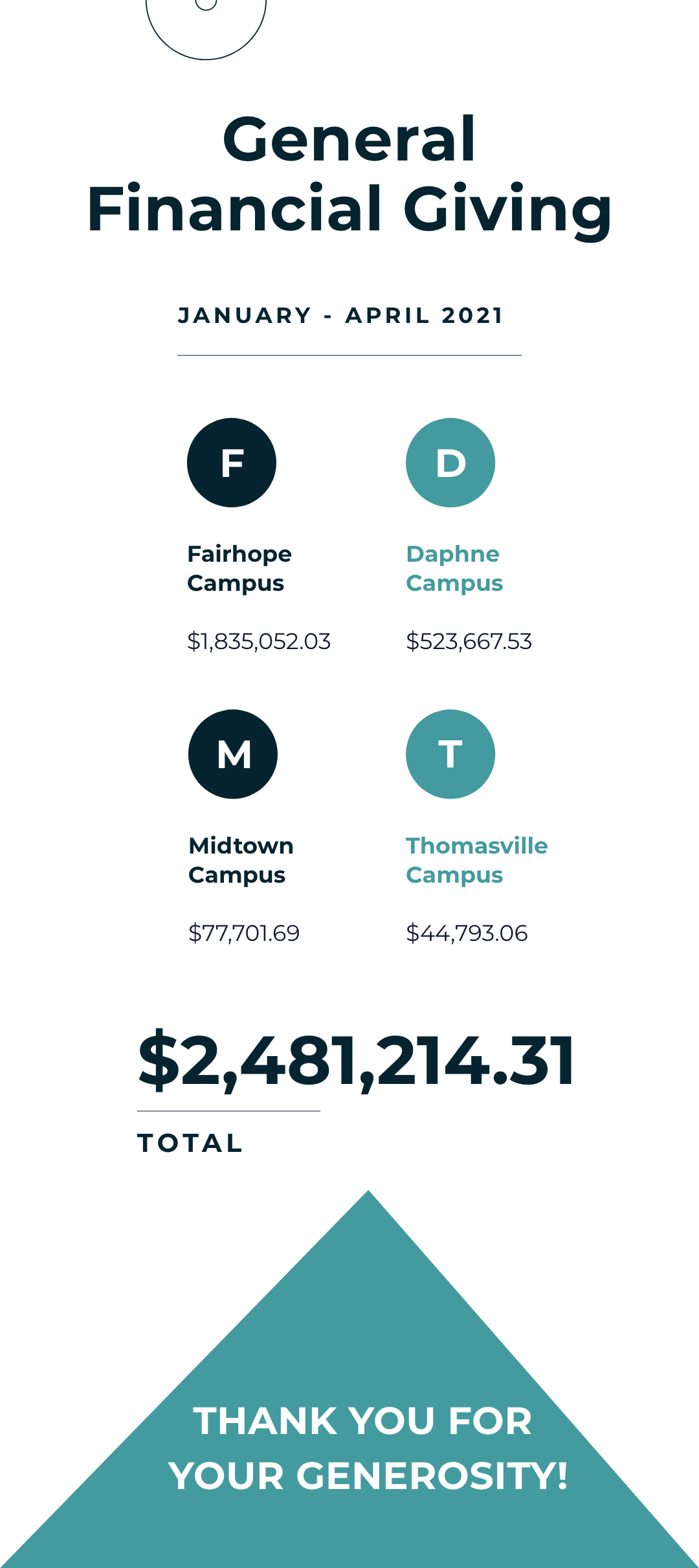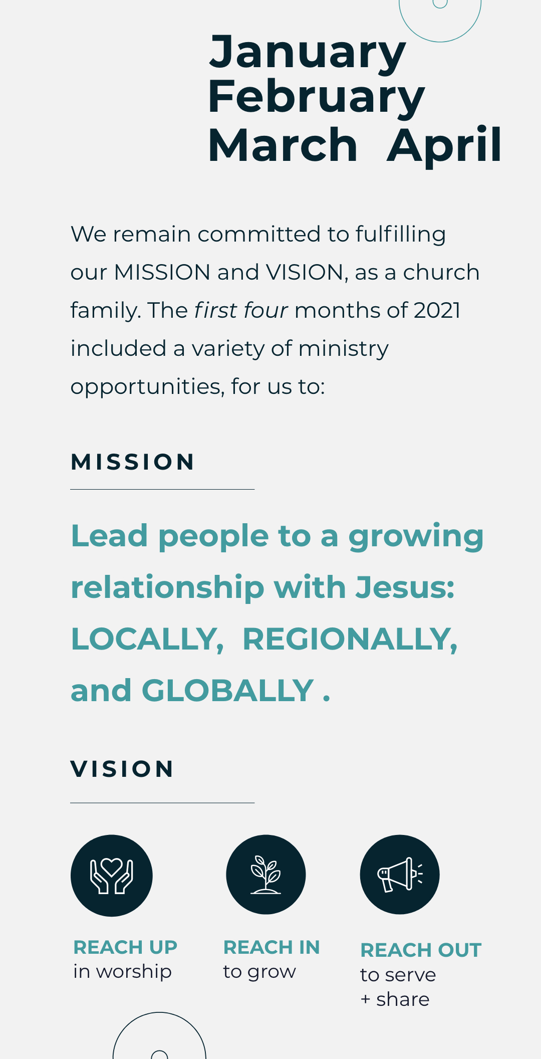 We remain committed to fulfilling our MISSION and VISION, as a church family. The first four months of 2021 included a variety of ministry opportunities, for us to: