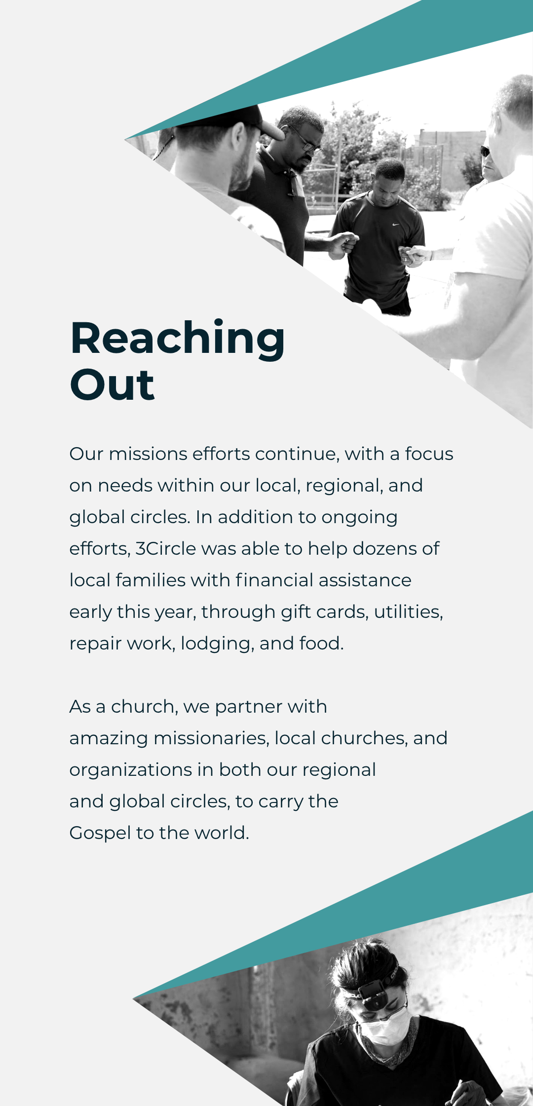 Our missions efforts continue, with a focus on needs within our local, regional, and global circles. In addition to ongoing efforts, 3Circle was able to help dozens of local families with financial assistance early this year, through gift cards, utilities, repair work, lodging, and food.